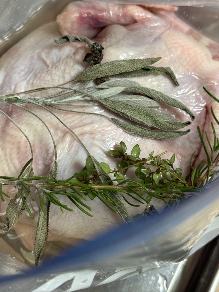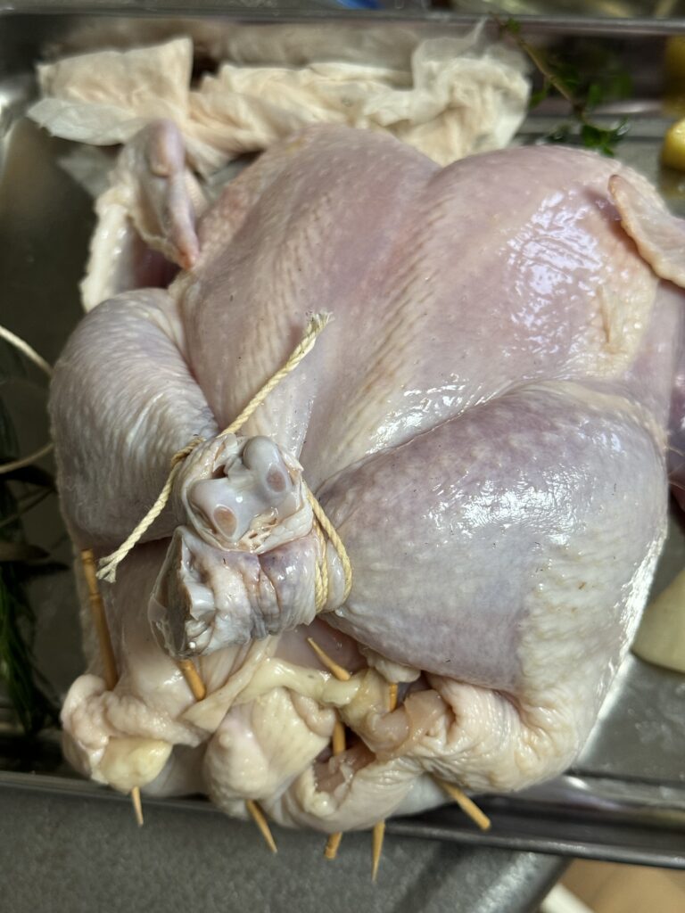 1. 漬け込んだ丸鶏は冷蔵庫から出しソミュール液から出す
