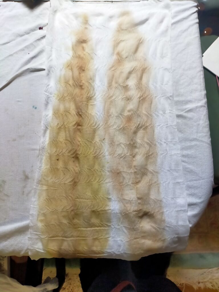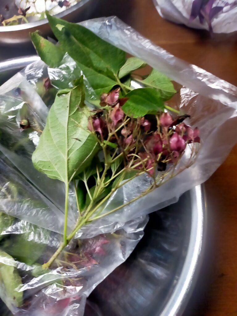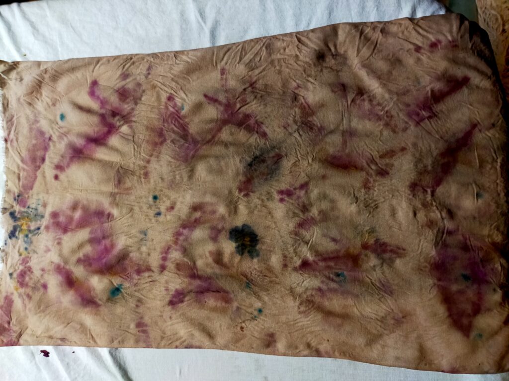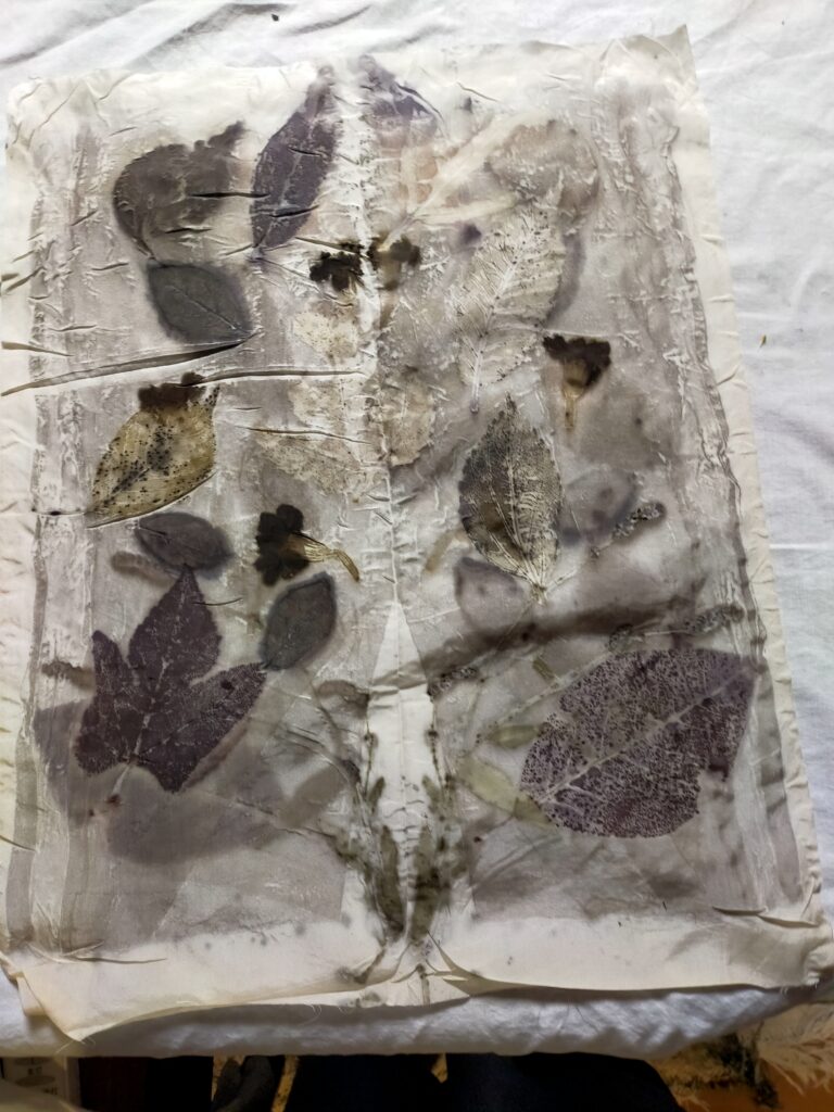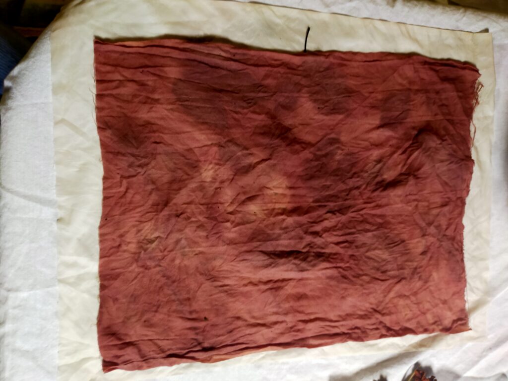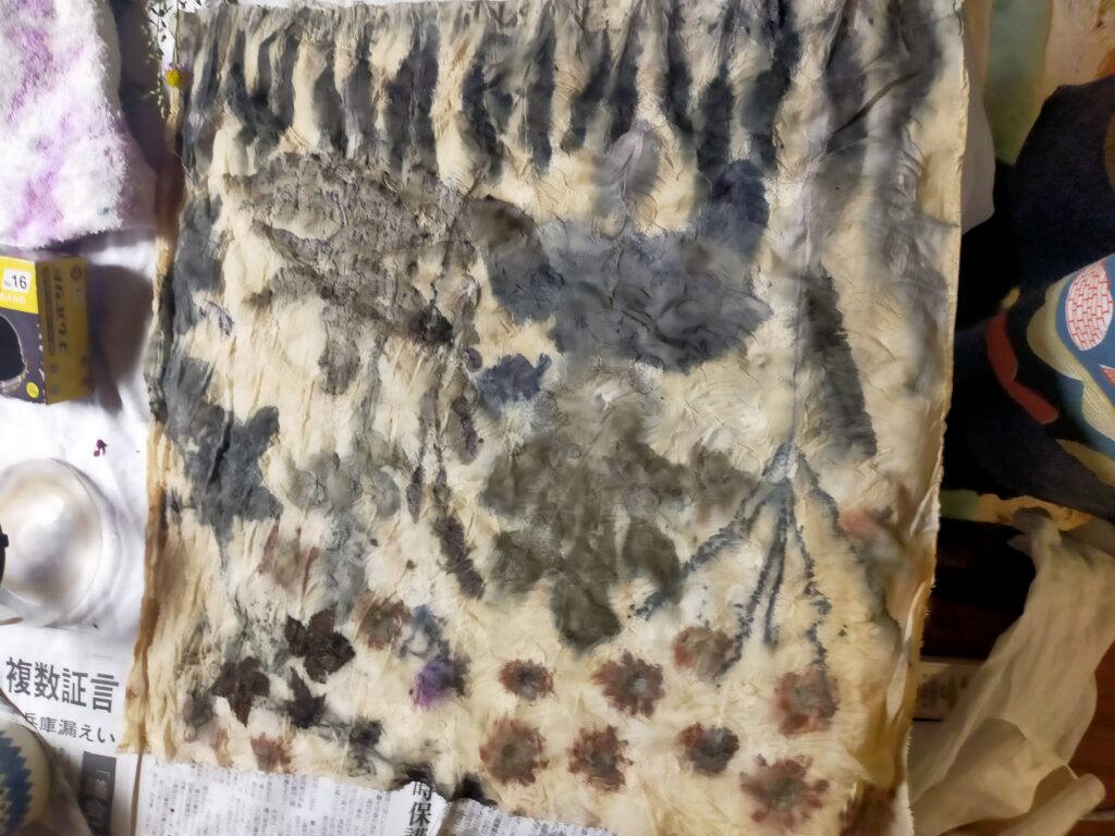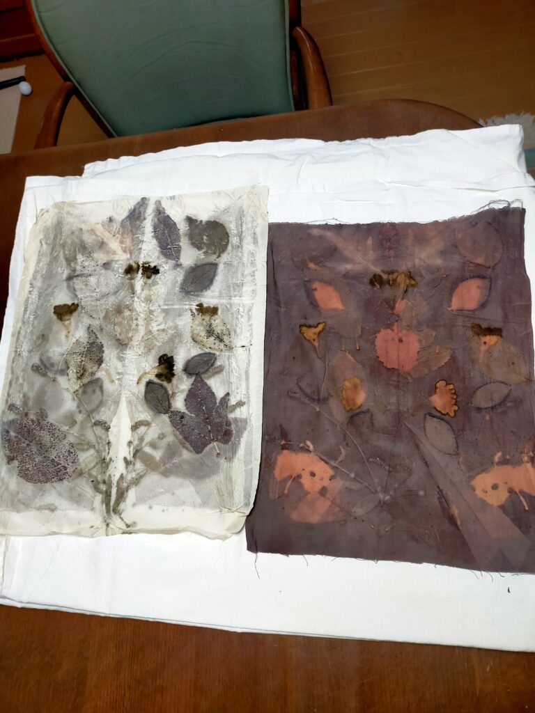 詳細は書きませんがアカソで染色した布と鉄媒染の布のエコプリントを合わせて蒸してみました。面白い感じになりました。