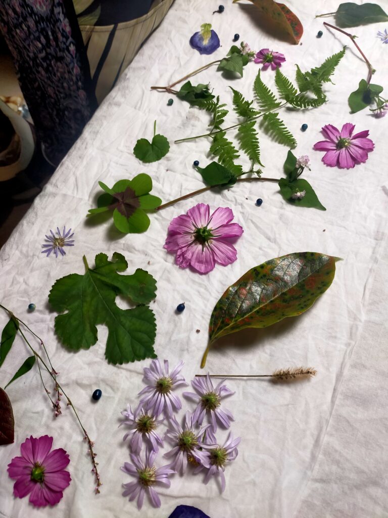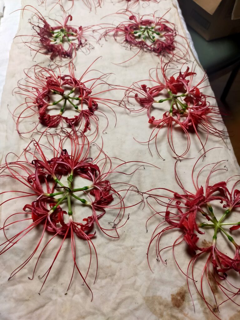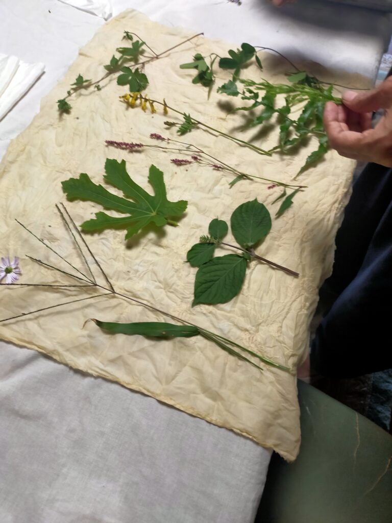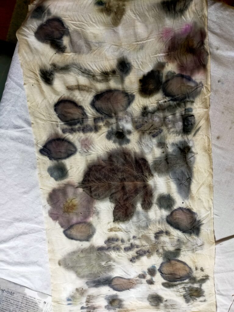 葉っぱや花びらを並べて布に包み、蒸したり、たたいたりして時間をかけることで、植物の中にある色素が布に移り、まるで草花がそのままプリントされたような模様があらわれます。