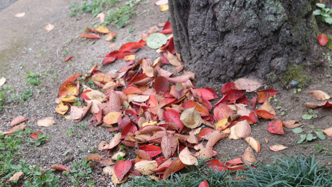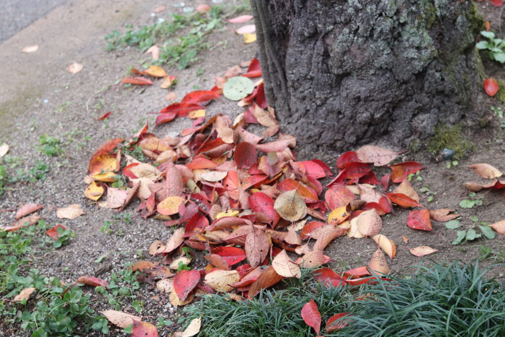 春の淡い桜色ではないけど、落ち葉感満載での濃い赤で素敵です。